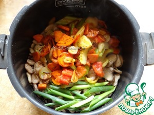 К фасоли выложить овощи, резанный зеленый лук, перцы, тимьян, влить бульон, подсолить по вкусу, добавить лавр;