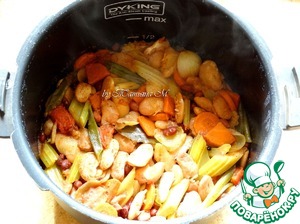 • К фасоли выложить овощи, резанный зеленый лук, перцы, тимьян, влить бульон, подсолить по вкусу, добавить лавр;