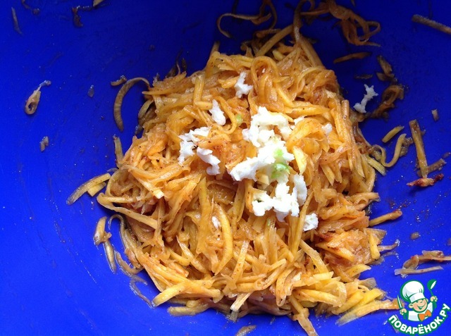 Тыкву очистить и натереть на терке для корейской морковки. Добавить соль, сахар и уксус. Помять все руками.
