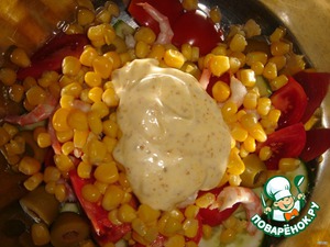Добавить кукурузу (тоже было не густо, но для салата хватило:)) и майонез, перемешанный с карри.
