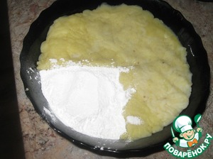 Прокрученный картофель разровнять рукой (лучше мокрой) и разделить ножом на 4 части. Одну часть картошки достать и на её место насыпать крахмал.