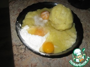 Вернуть тот картофель, который выняли ранее, в ту же ёмкость и ещё добавить туда 3 яйца и соль (по вкусу). Всё перемешать в однородную массу.