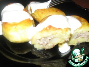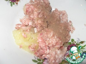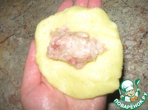 Теперь берём немного картофельной массы (что бы не прилипала к рукам, смочить их водой) и кладём немного фарша