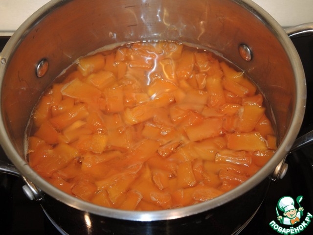 Довести тыкву с соком до кипения и варить до мягкости тыквы, примерно 20-25 минут.