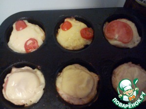 Затем помидорки нарезаем кружочками, сыр ломтиками толщиной 0,5 см. Через 25 минут достаем кексы из духовки, кладем на каждый сыр и помидорный ломтик и ставим в духовку еще на 5-7 минут, чтобы сыр расплавился и слегка зарумянился.