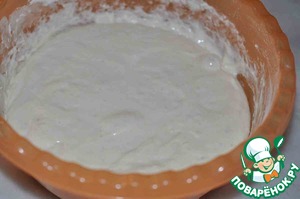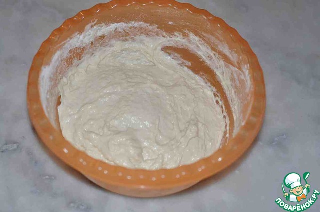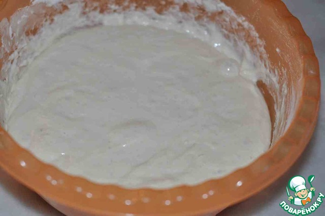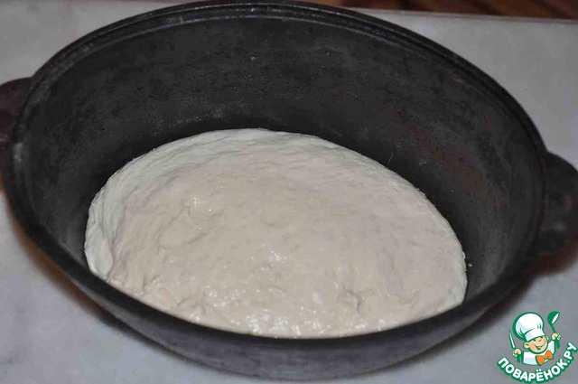 Добавить муку, соль и оставшуюся воду. Замесить тесто (можно ложкой, можно руками) и оставить его в теплом месте на 1 час