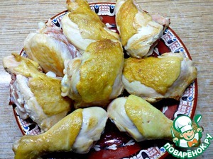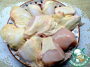 Курицу вымыть, обсушить и нарезать на порционные куски.