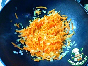 Лук и морковь очистить, морковь вымыть. В сотейнике обжарить нарезанный мелким кубиком лук и натертую морковь в течении 3-4 минут. Можно обжарить на том же масле, на котором обжаривали курицу.
