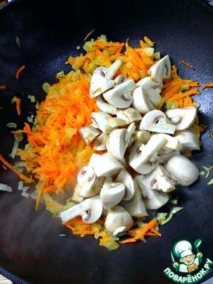 Грибы промыть, разрезать на 4 части (если маленькие) или ломтиками. Добавить к моркови и пассеровать еще 5 минут. Добавить вино и дать ему выпарится пару минут.