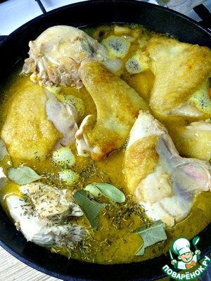 Положить в сотейник с овощами обжаренные куски курицы, добавить 500 мл горячей воды, лавровый лист и тимьян. Накрыть крышкой и тушить 30-40 минут.