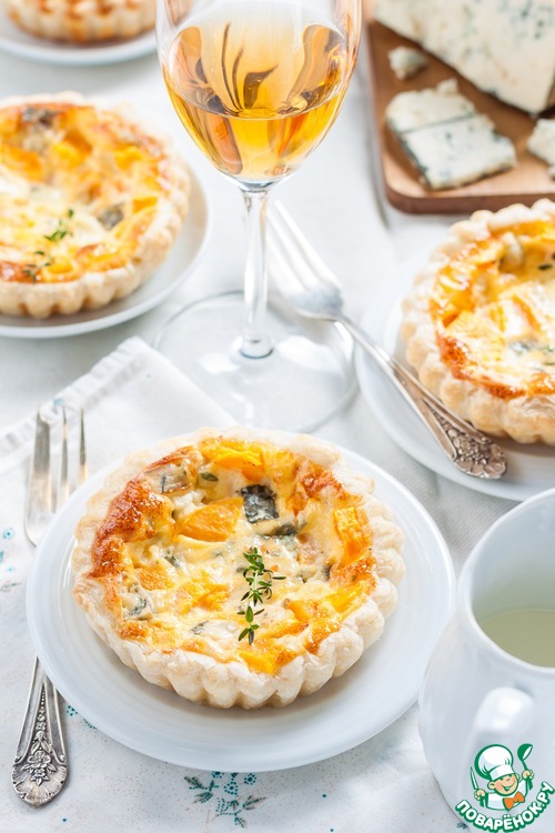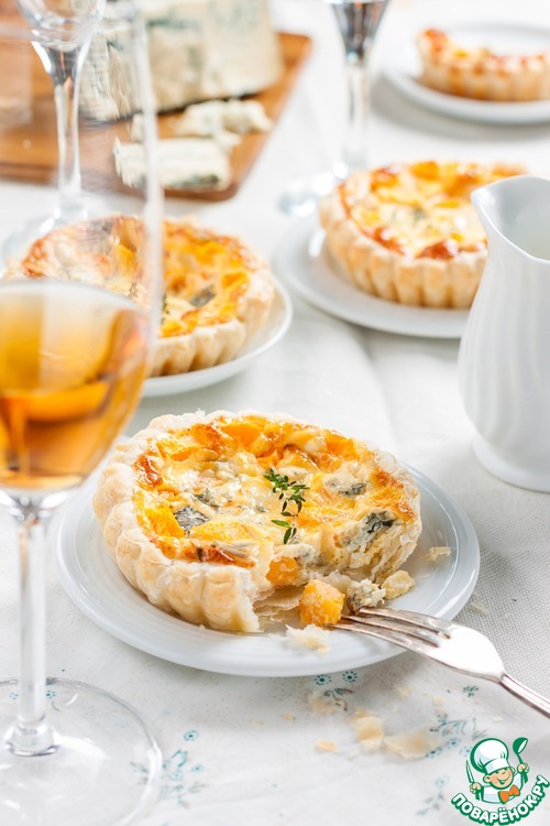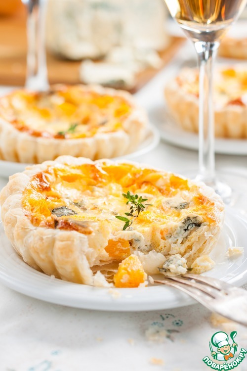 Легкую сладость тыквы, остринку сыра с плесенью, пряность тимьяна объединяет сливочно-яичная заливка на хрустящем слоеном тесте. В результате получается идеальная закуска к белому вину