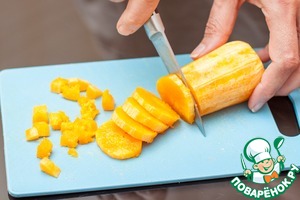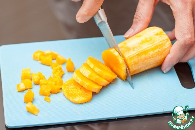 Очищенный кусочек тыквы запечь в микроволновке или духовке до мягкости. Я запекала в СВЧ 10 минут. Нарезать кубиками