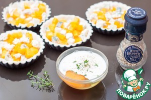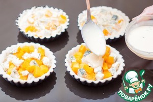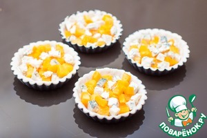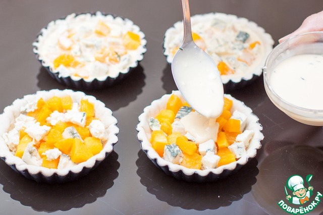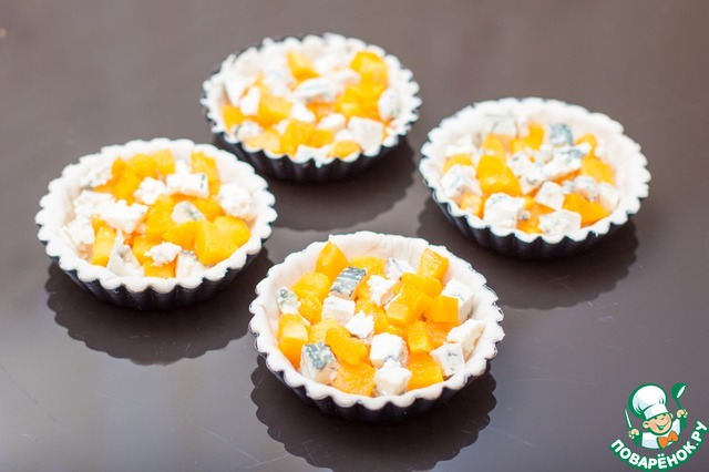 Положить в формочки с тестом кусочки тыквы и голубого сыра