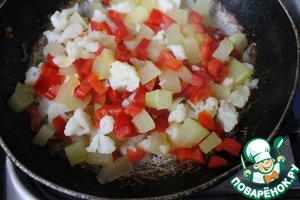 Кабачок, перец, цветную капусту нарезать на небольшие равные кусочки и варить в подсоленной воде примерно 10 мин. Шумовкой вынуть овощи и обжарить на оливковом масле до мягкости.