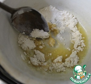 Приготовить ру - смесь сливочного масла и муки. В сотейнике растопить сливочное масло и смешать с мукой, помешивая, на слабом огне.