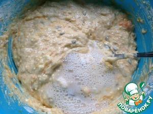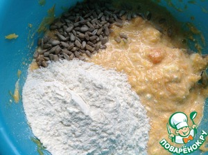 Добавить семечки и муку. Вымесить тесто лопаткой.