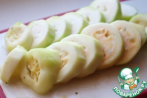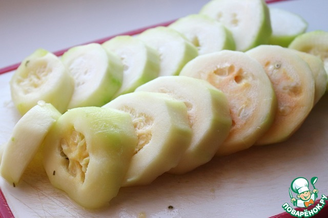 Кабачки нарезать кружочками толщиной 1 см, обсушить при помощи бумажных полотенец (у моих кабачков кожица была очень твердая, поэтому я ее срезала. В идеале лучше брать молоденькие кабачки)