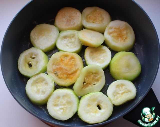 На сковороде большого диаметра растопить сливочное масло. На среднем огне обжаривать кабачки в течение 2-3 минут, постоянно помешивая. Кабачки не должны зарумяниться.