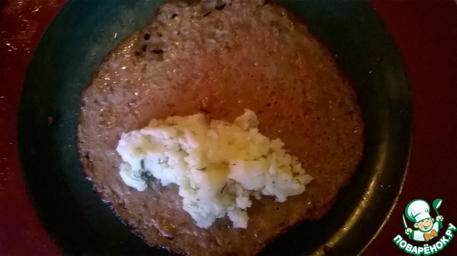 Остужаем. Кладём начинку на край блинчика, заворачиваем и укладываем в смазанную маслом форму. Если где треснет не беда, начинка эта не вытекает. А остальное мы замаскируем.