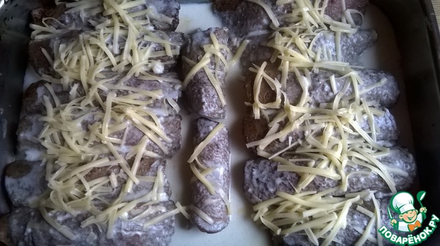Заливаем рулетики соусом. Добавляем немного звуков Франции, как же без них))) Т. е. присыпаем тёртым сыром. Так и симпатичнее и поможет скрыть наши "косяки" если блинчики где то треснули. -