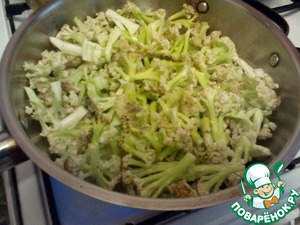 Разделываем капусту на соцветия, заливаем водой, добавляем подсолн. масло, начинаем тушить на среднем огне минут 10-12, солим, все перемешиваем.