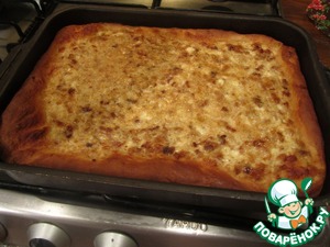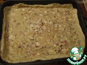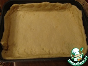 • Тесто раскатать в пласт. Форму для выпекания смазать растительным маслом и выложить туда тесто с бортиками.