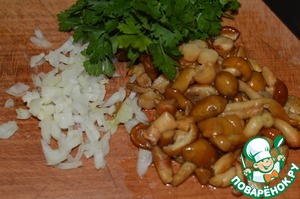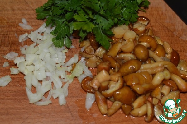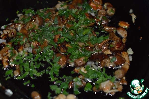 • 2. В сковороде разогреть масло, обжарить лук до прозрачности, добавить грибы и обжаривать до золотистого цвета. Затем добавить петрушку, соль, перец и снять с огня.