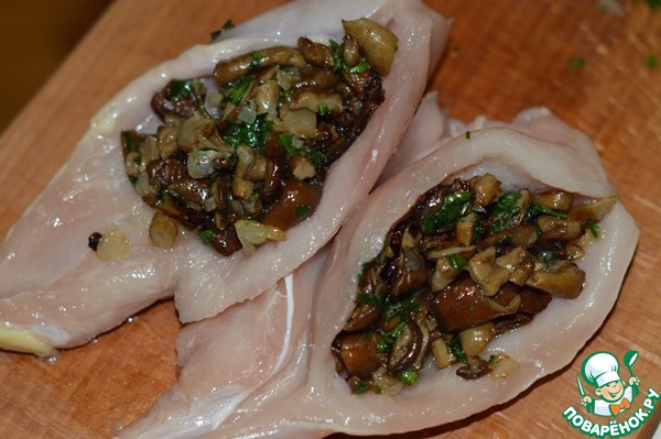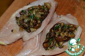 • 3. Куриное филе вымыть, обсушить, сделать надрезы-кармашки. Выложить в кармашки грибную начинку. Аккуратно соединить кармашки, можно сколоть зубочисткой, чтоб начинка не выпала.