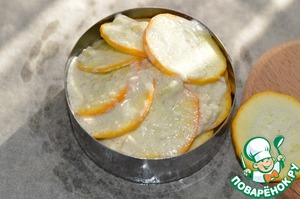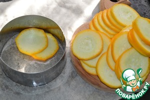 • 5. В форму, я брала кольцо диаметром 10 см, смазанную маслом, выкладывать слой кабачка, слой сливочного соуса. Затем снова кабачки и соус. Духовку разогреть до 180С. Поставить форму с курицей и форму с кабачками в духовку. Готовить примерно 20 минут. Вы ориентируйтесь на свою духовку и количество продуктов. За пять минут до готовности запеканки посыпать верх тертым сыром.