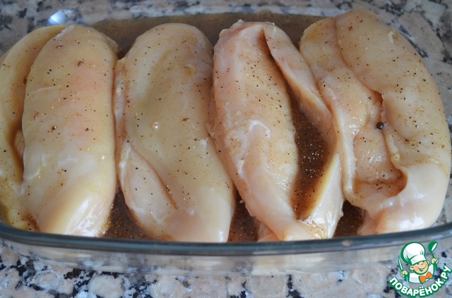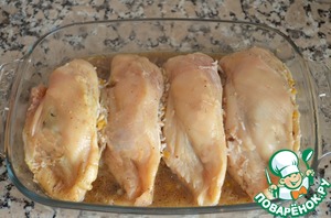 7. Посыпать грудки солью и перцем и запекать в маринаде при температуре 200С 20-25 минут до готовности. Можно подать с тушеными или жареными овощами.