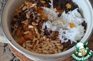 4. Выложить в кастрюлю готовый рис, сухофрукты, орехи, душистый перец, гвоздику и корицу.