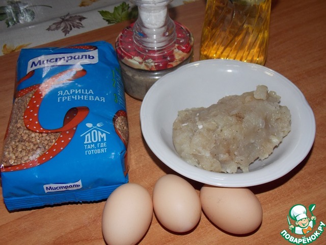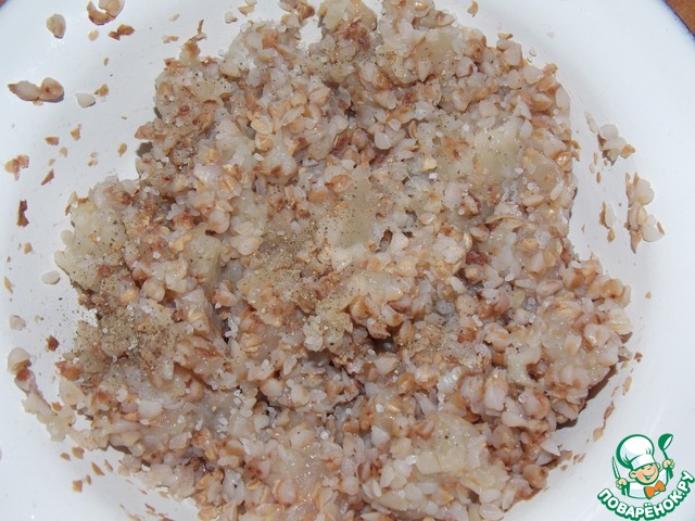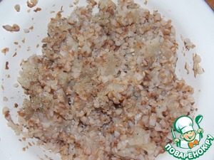 Смешать отварную гречку с фаршем. Посолить и поперчить по вкусу.