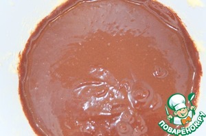 Продолжая взбивать, тоненькой струйкой вливаем растопленный шоколад в масляно-яичную смесь.