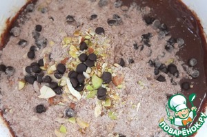 Добавляем половину сухой смеси, орехи, шоколадные капли, перемешиваем.