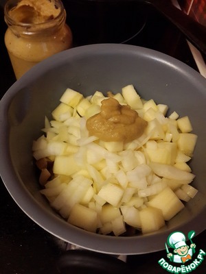 Добавить картофель, лук репчатый, горчицу, соль, влить бульон