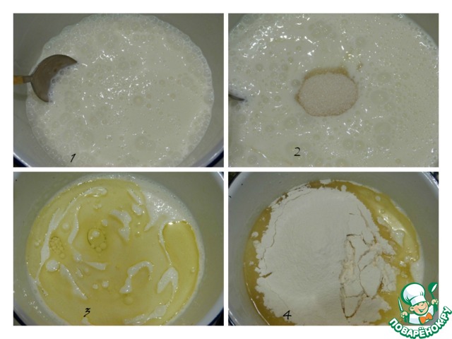 В кефир комнатной температуры добавляем соду, перемешиваем и ждем около минуты пока сода провзаимодействует с кефиром, должны появиться пузырьки.