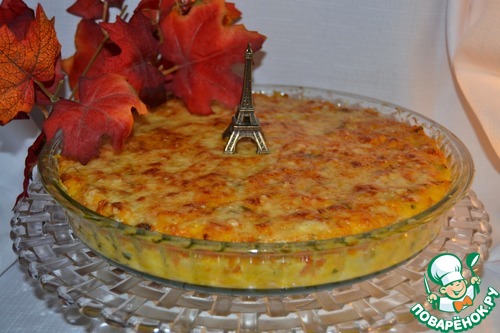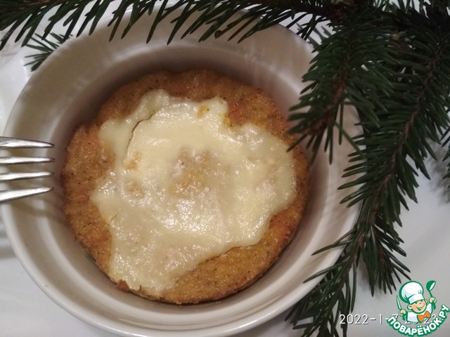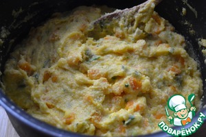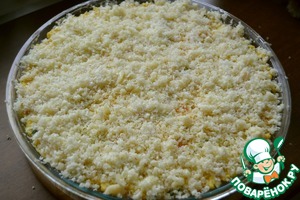Наполнить его смесью поленты. Сверху посыпать тертым сыром.