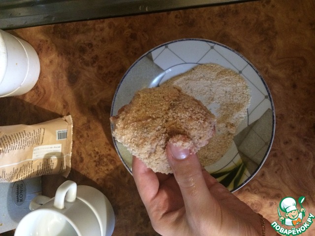Начинаем панировать наши куриные голени, обмакиваем в Льезон и в сухари, и повторяем заново этот шаг, повторно обмакиваем в Льезон и сухари.