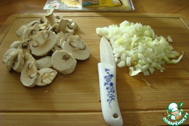 Отварите куриное филе до готовности и мелко нарежьте. Шампиньоны почистите и нарежьте, лук мелко покрошите.
