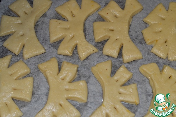 10. Затем еще 3 надреза как на фото и выгнуть заготовку дугой. Выложить булочки на застеленный пергаментом противень. Накрыть пленкой и оставить на 1 час для расстойки. Взбить яйцо с ложкой молока и смазать булочки. Выпекать при 180 град. в течение 18 минут до золотистого цвета.