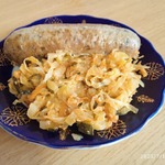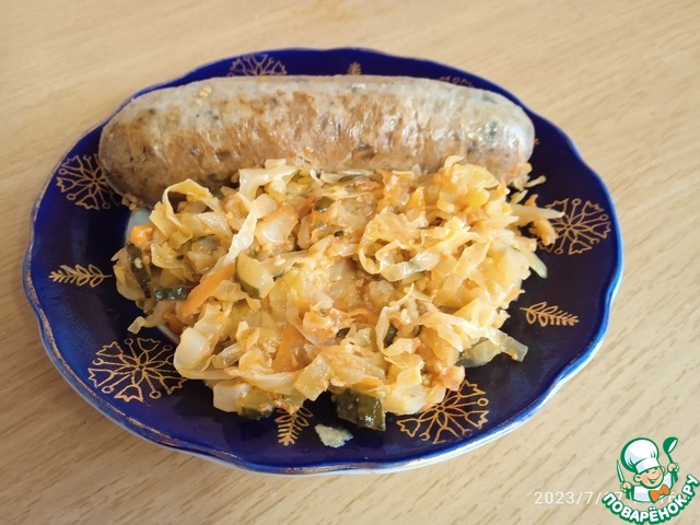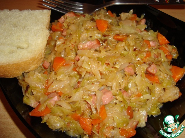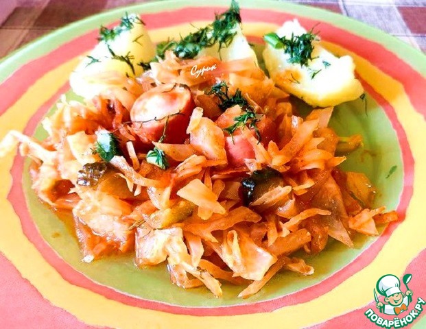 Добавляем нарезанные кубиками сосиски, тушим две минуты.