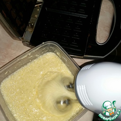 Пока я замешивала тесто, моя электровафельница успела нагреться. В форму выкладываем 2 столовые ложки теста и закрываем крышку на 3-5 минут. В зависимости от температуры.