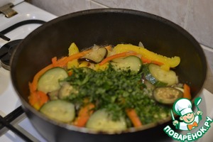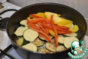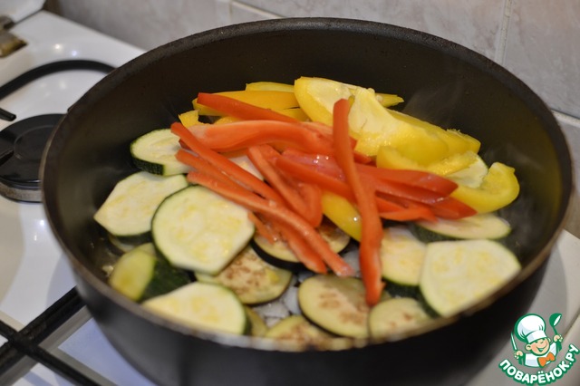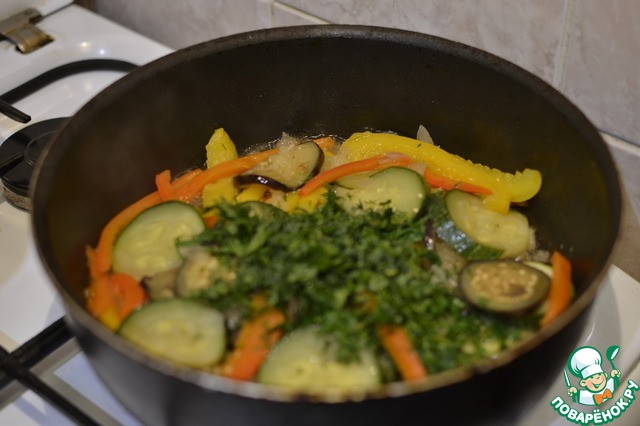 К луку добавляем цуккини, баклажаны и перец, обжариваем минут 10-15