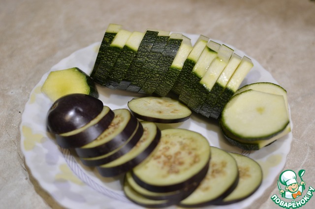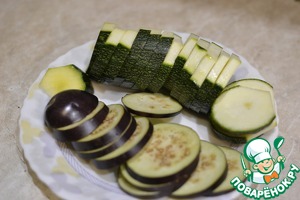 Перец нарезать длинненькими полосочками, кабачок и баклажан кружочками