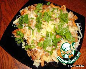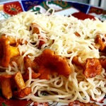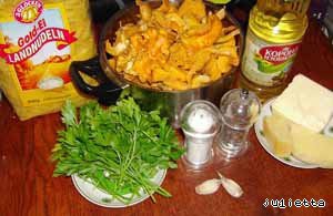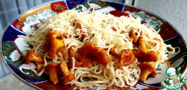 Переработанный мною рецепт от Юлии Высоцкой. Она предлагала взять и грибов и сухих макарон в равных пропорциях и, соответственно, блюдо называлось не "лисички с макаронами", а "макароны с лисичками". А это уже, согласитесь, совсем другой коленкор... Ну и ещe кое-что поменяла по мелочам, приблизив рецепт к нашей действительности...