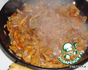 Добавить лисички и сразу как следует их посолить и поперчить. Перемешать и минут 5 подержать под закрытой крышкой, а когда пущенный грибами сок закипит, крышку открыть и тушить, не закрывая крышкой, минут 15—20, периодически помешивая, пока жидкость почти вся не выпарится.