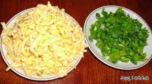 Сыр натереть на крупной терке, зелень мелко порубить.