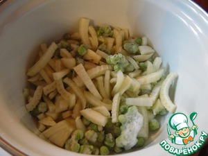 • Фенхель нашинковать, смешать с зеленым горошком, выложить в небольшую кастрюльку.