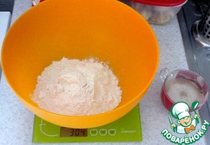 Жидкость влить в муку и начать перемешивать тесто. Немного вымешав его в миске, продолжайте замешивать на столе или на пирожковой доске. Используйте оставшиеся 30 г муки для вымешивания теста.