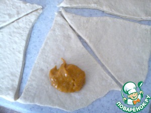 Начинка может быть любая (сладкая или соленая). Главное условие - не слишком жидкая. У меня - абрикосовое варенье, в которое я добавила 30 г крахмала. В достаточно густое варенье можно ничего не добавлять. Отлично такие рогалики получаются с начинкой из сгущенки и кокосовой стружки (просто намажьте такой смесью треугольнички перед сворачиванием).